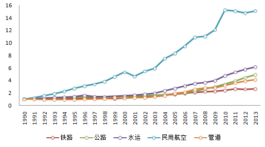 作為我國(guó)的經(jīng)濟(jì)命脈,鐵路、公路、水路、民用航空、管道等運(yùn)輸方式的快速發(fā)展促進(jìn)了我國(guó)各區(qū)域之間的人員及貨物交流,促進(jìn)了資源的合理配置。在1990-2013年間,我國(guó)各主要運(yùn)輸方式在貨運(yùn)量方面取得了飛速的增長(zhǎng),其中航空運(yùn)輸?shù)呢涍\(yùn)量增速最為明顯;在結(jié)構(gòu)方面也在不斷調(diào)整,鐵路運(yùn)輸貨運(yùn)量呈現(xiàn)降低趨勢(shì)而水路運(yùn)輸貨運(yùn)量呈現(xiàn)上升趨勢(shì)。