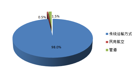 由圖3可知,傳統(tǒng)運(yùn)輸方式在我國(guó)整體貨物運(yùn)輸中仍然占主要地位。鐵路、公路及水路貨運(yùn)量共占我國(guó)總體貨運(yùn)量的98%以上。盡管民用航空及管道運(yùn)輸在近年來發(fā)展迅速,但在我國(guó)總體貨運(yùn)量中占比仍然較小。
