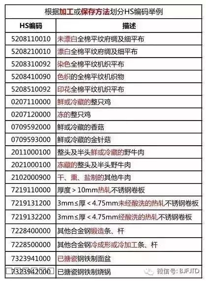 如:鮮的、冷藏的、冷凍的、干的、熏制、鹽腌、糖漬、烹煮、焙炒、去殼的、提純、精制、發(fā)酵、滾壓、未搪瓷、切割、鍛造、沖壓、冷軋、冷拔、熱軋、鉚接、電鍍、鍍鋅、包金、包覆、編結、鑲嵌、酸洗、針織、機織、鉤編、印花的、染色的、色織的、漂白、未漂白、未梳的、浸漬、涂布、與棉混紡、玻璃吹壓成膜、冷卻成型、人工合成、未經化學處理的……