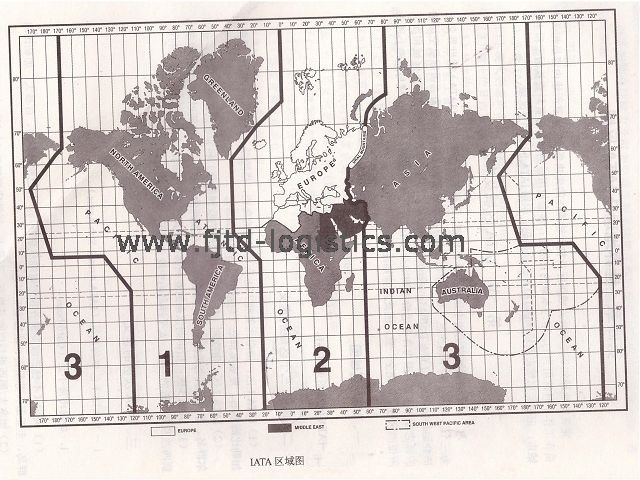 為了制定國(guó)際空運(yùn)中運(yùn)價(jià)的計(jì)算規(guī)則,國(guó)際航空運(yùn)輸協(xié)會(huì)(IATA)把全球劃分為三個(gè)大的區(qū)域,及各大區(qū)下面又細(xì)分為多個(gè)小區(qū)域(次區(qū))。這樣劃分出的區(qū)域稱為“國(guó)際航空運(yùn)輸協(xié)會(huì)運(yùn)價(jià)協(xié)調(diào)區(qū)(IATA Traffic Conference Areas)”,簡(jiǎn)稱IATA區(qū)域。