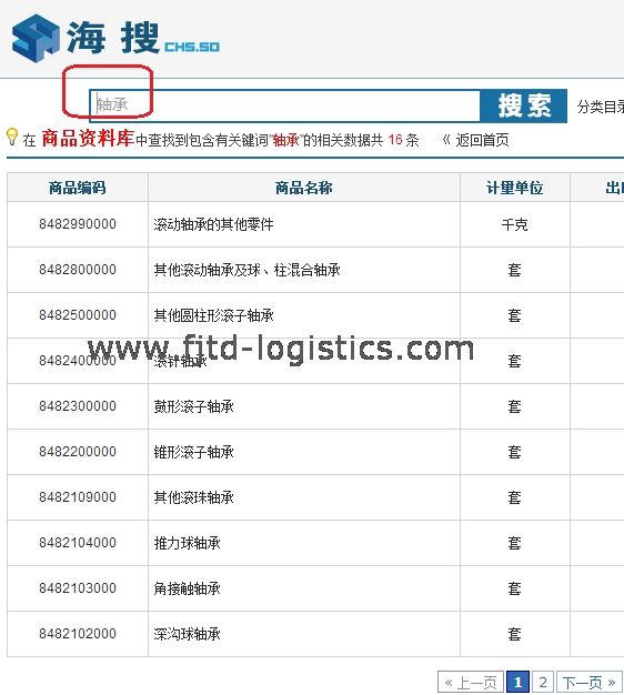 輸入“軸承”,點擊“搜索”,出來幾十條相關內容(出來越多,說明這個品名越常見;越常見的品名,越容易確定HS編碼)