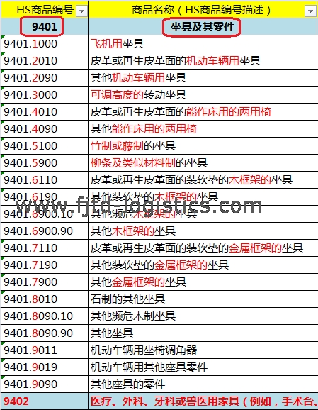 如:坐具(各種椅子、座椅)都歸入94.01(第94章第1個品目,此品目描述為“坐具(包括能做床用的兩用椅,但品目94.02的貨品除外)及其零件”),坐具(94.01)主要根據(jù)“用途”和“材質”進一步細分:
