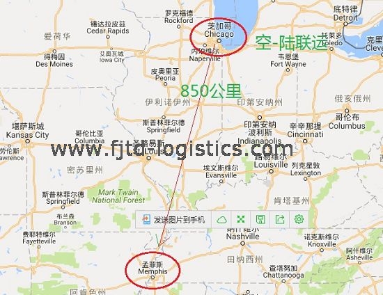 辦法總是有的。我是怎么做的呢?第一反應(yīng)想到了是否可以空-陸聯(lián)運(yùn),因?yàn)椴榭吹貓D發(fā)現(xiàn)孟菲斯距離芝加哥不算太遠(yuǎn)(約850公里),因?yàn)槲覀冎?,芝加哥位于美?guó)中部,無論空運(yùn)、鐵路還是公路運(yùn)輸都非常發(fā)達(dá),到美國(guó)內(nèi)陸的很多貨物都是通過芝加哥中轉(zhuǎn),芝加哥可以算是美國(guó)最大、最有名、最發(fā)達(dá)的交通樞紐和轉(zhuǎn)運(yùn)中心。