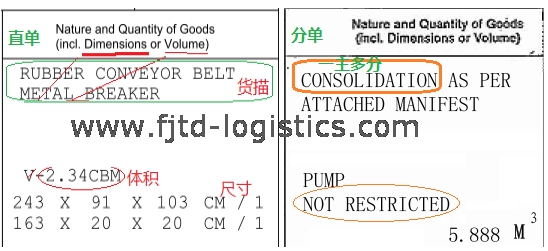 Consol和consolidation意思差不多,都是表示“混載”“拼裝”,一般可以通用。如果一個航空主單(MAWB)對應(yīng)多個航空分單(HAWB),且貨物種類較多,就會在主運單“貨物描述”(Nature and Quantity of Goods(incl. Dimensions or Volume))那里打上“Consol”字樣。如果一個主運單對應(yīng)多個分單,但是品名只有一個,可以不打“Consol”字樣,只需要打該貨物的實際品名也可以。