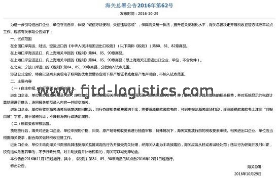 10月30日消息,昨日,海關(guān)總署發(fā)布《海關(guān)總署公告2016年第62號》,將開展稅收征管方式改革試點工作。該公告將于2016年11月1日起正式施行,《中華人民共和國進(jìn)出口稅則》(以下簡稱《稅則》)第84、85、90章商品的試點自2016年12月1日起施行。