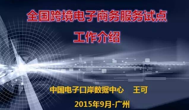 海關(guān)總署數(shù)據(jù)中心副主任王可先生在2015年9月19日廣州的中國跨境電商大會暨海貿(mào)會代表海關(guān)對跨境電商年會的支持發(fā)表演講“全國跨境電子商務(wù)海關(guān)服務(wù)詳細介紹”