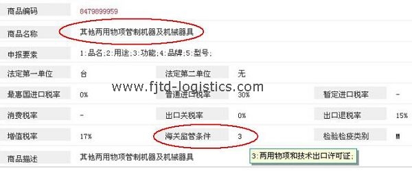2. HS編碼8479899959其他兩用物項管制機器及機械器具——海關(guān)監(jiān)管條件還有——兩用物項和技術(shù)出口許可證(代碼3)