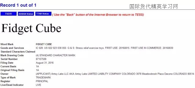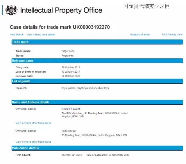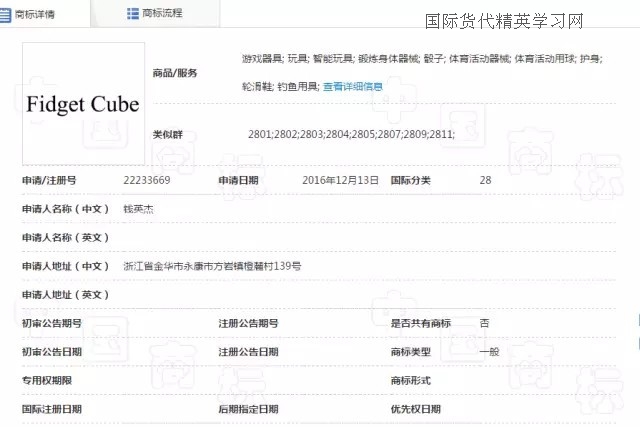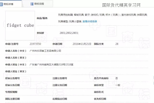 最后,減壓魔方(Fidget Cube),小編查到中國關(guān)于fidget cube 商標(biāo)注冊情況時,瞬間驚呆!從去年11月份到今年1月份,一共有4位申請人提交了fidget cube 申請28類,歐盟和美國也有申請,同一申請人ANTSY Labs. LLC,由此,小編推斷,這款魔方的發(fā)明者很有可能就是這家美國公司,也有可能申請了美國的外觀和發(fā)明!也是在去年下半年,是一名英國人向英國商標(biāo)局提交了fidget cube 28類的商標(biāo)申請。截至目前,fidget cube就是在日本沒有檢索到相同的商標(biāo)申請,但是,日本的商標(biāo)檢索盲期也有2-3個月,因此,也很難說在3月份到現(xiàn)在是否有人提交了fidget cube 的商標(biāo)申請!