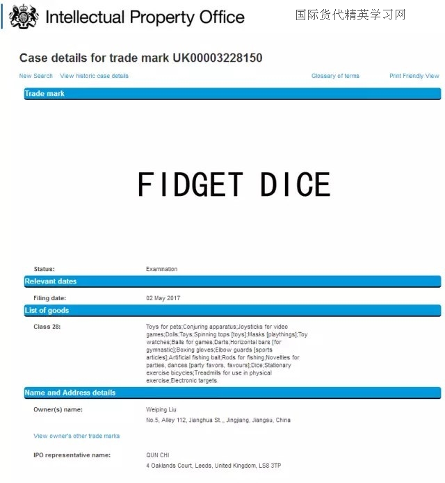 方信小編順手研究了一下相關(guān)還有沒有類似的商標(biāo), 結(jié)果還發(fā)現(xiàn)了一個減壓骰子(fidget dice),就在前幾天,來自江蘇省的朋友向英國商標(biāo)局申請了fidget dice 28類商標(biāo)。
