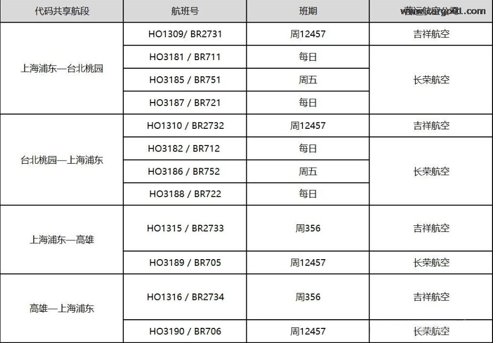 此次吉祥航空與長榮航空在上海浦東—臺北桃園和上海浦東—高雄航線的代號共享合作具體如下: